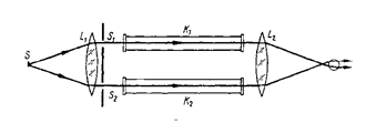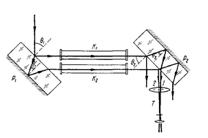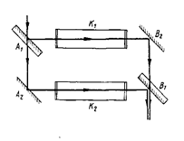 Роль делителей пучков играют полу отражающие плоско параллельные пластины A1 и B1, A2 и B2 -зеркала. Эта схема позволяет значительно раздвинуть пучки света и ввести кюветы K1 и K2, одна из которых окружена печью (для исследования паров металла). Наблюдаются горизонтальные полосы равного наклона, соответствующие (при отсутствии кювета низким порядкам интерференции)