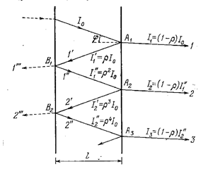 В многолучевых интерферометрах используется интерференция при мн6огократных отражениях света от двух параллельных поверхностей (метод деления амплитуды). На этом принципе действует интерферометр Фабри- Перо, широко используемый в спектроскопии высокого разрешения и в метрологии (рис.6)