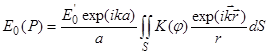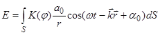 -волновое число, r-расстояние от элемента поверхности dS до точки P. Множитель αо определяется амплитудой колебания в том месте, где находится dS. Коэффициент K зависит от угла
