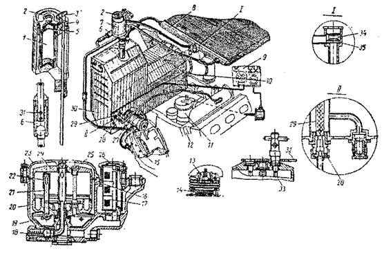 1 - фильтр; 2,13,14 - пробки; 3 - щуп; 4, 28 - накидные гайки; 5 - сапун; 6 - перепускной клапан; 7 - заправочный бачок; 8 - масляный радиатор; 9 - центральный щиток; 10- подогреватель; 11 - центробежный масляный фильтр; 12 - двигатель; 15 - масляный насос двигателя; 16 - уплотнительное кольцо; 17 - фильтрующий элемент фильтра грубой отчистки; 18 - обратный клапан; 19 - корпус фильтра; 20, 23, 26 -крышки; 21 - маслозаборная трубка; 22 - защитная сетка; 24 - ротор; 25 - гайка; 27 - маслозакачивающий насос МЗН-З; 29 - фильтр; 30 - масляный бак; 31, 34 - пружины; 32 - ключ сб20-30-67; 33 - шпилька ротора; 35 - клапан.