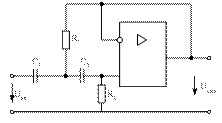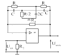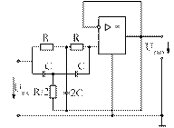 Избежать применения индуктивности в узкополосном фильтре (что особенно желательно в низкочастотных устройствах) позволяет использование двойного Т-образного моста. При точном подборе одноименных элементов моста в соотношениях, указанных на схеме узла с RC-фильтром в табллице 2.2, ослабление, обеспечиваемое мостом на частоте квазирезонатора fc=1/(2pRC), стремится к бесконечности, а фазовый сдвиг выходного напряжения по отношению ко входному стремится к нулю. Следовательно, по основным свойствам двойной Т-образный мост напоминает параллельный колебательный контур. Добротность такой частотно-селективной цепи можно уменьшить, подключив к ней резистор R. Выбором сопротивления ri можно добиться требуемой полосы пропускания фильтра. Указанные свойства двойного Т-образного моста используются в режекторном фильтре (см. таблицу 2.2). На частоте режекции мост представляет собой очень большое сопротивление, и, следовательно, фильтр эффективно ослабляет эту частоту. Операционный усилитель выполняет здесь функцию высококачественного буферного усилителя, способствующего получению высокой добротости фильтра. В фильтре используется 100% ООС по напряжению. Поэтому максимальный коэффициент передачи вне полосы режекции не превышает единицы. Глубокая ООС обеспечивает высокую стабильность режима работы фильтра.