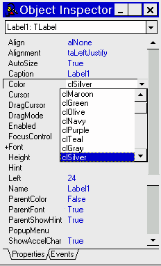 Во время дизайна для настройки внешнего вида и поведения объекта используется Инспектор Объектов. Например, можно изменить цвет фона у объекта TLabel на форме. Для этого в Инспекторе Объектов выберем свойство Color. Справа от свойства есть маленькая стрелка, она означает, что мы можем выбрать цвет из списка (рис.1).