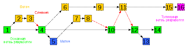 На рис. 2 условно показан пример эволюции ветвей в хранилище. Зелёным цветом показана основная линия разработки проекта, жёлтым - ветви, синим - метки, пурпурным - ветвь, разработка которой прекращена. Красными стрелками показаны слияния изменений.