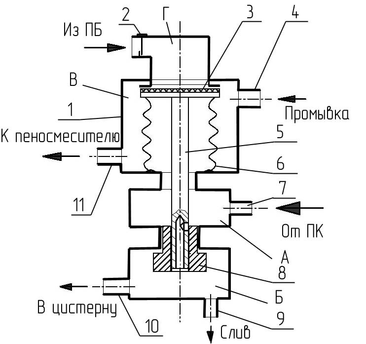 При тушении пожара пеной в случае отключения пенных стволов клапаном 3 будет перекрыто поступление пенообразователя через штуцер 11, полости Г и В будут разобщены и поступление пенообразователя к пеносмесителю прекратится. При возобновлении работы стволов поступление воды из ПК прекратится. Сильфон, занимая исходное положение, вытолкнет воду через полость А и Б и штуцер 10 в цистерну.