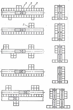 Типовые схемы компоновок автоматизированных складов показаны на рисунке 12.14, где 1 — робот-штабелер, 2 — стеллажи, 3 — приемно-выдающие устройства.