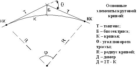 Радиус кривой задается в проекте и зависит от категории дороги, а также от угла поворота трассы. Угол поворота трассы снимают с плана и определяют из таблиц[5] элементы круговой кривой: Т, К, Д, Б (рис. 173).