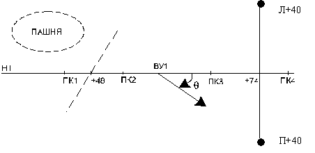 При подходе к углам поворота производят вставку кривой и пикетаж считают по кривой (длина трассы определяется по прямым вставкам и кривым).
