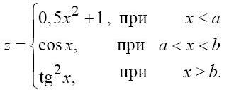 В алгоритме после ввода любых значений х, a и b и проверки условия в блоке 3 значение функции z может вычисляться по одной из трех альтернативных ветвей: в блоке 4, 5 или 6. При этом, так как количество альтернативных ветвей больше двух, около соответствующего вывода блока 3 указывается условие перехода на соответствующую ветвь, а внутри самого блока указывается лишь имя переменной х.