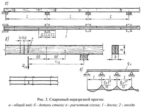 Располагаются поперек скатов крыш и опираются на основные несущие конструкции покрытия и поперечные стены, к которым крепятся так же, как и однопролетные прогоны. Спаренный прогон состоит из двух рядов досок на ребро, соединенных гвоздями. Между стыками доски соединяют конструктивными гвоздями через каждые 0,5 м. Такие прогоны рекомендуется применять только в сочетании с настилами, воспринимающими скатные составляющие.