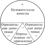 Целесообразнее разрабатывать “модель руководителя органа внутренних дел” на основе понятия диалектико-логической формы. Представим качества руководителя органа внутренних дел в виде круга, нижняя часть которого соответствует отрицательным качествам, а верхняя — положительным. Среди отрицательных качеств выделяются неприемлемые и допустимые. Отрицательные допустимые качества могут “компенсироваться” положительными качествами.
