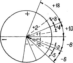 Выделим в круге сектора +1, +2 и -1, -2. Пусть сектору +1 соответствует такое положительное качество, как способность принимать решения в сложных условиях (максимальная оценка — +10 баллов); сектору +2 — управленческие знания (максимальная оценка — +18 баллов) и т.д. Сектором -1 обозначено такое отрицательное качество, как грубость (предельная оценка — -8 баллов); сектором -2 — несдержанность (предельная оценка — -6 баллов) и т.д.