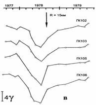 На Ашхабадском прогностическом полигоне (рис. 12. 17 а) разбита сеть магнитометрических наблюдений для прогнозирования геомагнитных предвестников землетрясений. Пример изменения магнитной аномалии по одному из профилей перед местным землетрясением приведен на рис.12.17 б.