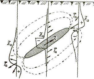 и моделированию. На рис 12.8 моделировано магнитное поле от наклонно залегающего линзовидного тела для северного полушария Земли. Распределение векторов Та от вытянутого тела имеет своеобразный вид. У верхнего конца намагниченного тела вектора описывают «сходящийся веер», направленный в сторону объекта, а у нижнего конца линзы показан «расходящий веер», отмечающий место истока силовых линий. Указанные признаки поведения вееров Та совместно с аномальными графиками Zf являются критериями составления геологического разреза.