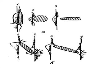 Магнитный источник в стороне от ствола скважины на записи имеет вид характерной боковой аномалии. Разновидности боковых аномалий представлены на рис. 12.10. Если скважина пересекает рудное тело, то магнитное поле похоже на типичные аномалии пересечения (рис. 12.11).
