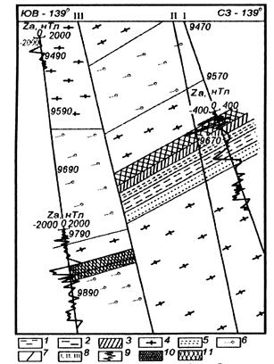 1 – гнейсы и мигматиты; 2 – биотит-плагиоклазовые гнейсы; 3 – порфировидные граниты; 4 – тальк – тремолит-флогопитовые сланцы; 5 – порфировидные граниты; 6 – биотит-плагиоклазовые гнейсы с высокоглиноземистыми материалами; 7 – «молодые» разломы с проявлением диафтореза; 8 – номера стволов; 9 – кривые Zа; 10 – предполагаемый пласт железистых кварцитов; 11 – пласт железистых кварцитов