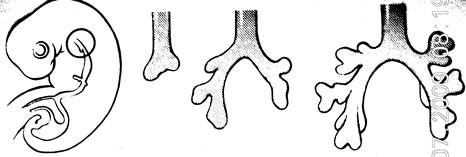 Первичное гортанно-трахейное выпячивание появляется на 4 нед. развития (Рис.1). Сначала оно имеет круглую форму и соединяется с вентрально-каудальною частью глотки. На дистальном конце выроста появляются два утолщения, которые называют легочными почками. Эндодермальные почки, которые составляют закладку паренхиматозной части бронхов и легких, начинают свое развитие внутри паренхимы, которая их окружает и образовывает строму легочных долек, хрящевые пластины, мускулатуру и соединительную ткань. Этапы формирования бронхиального дерева представлены на рис.1-5.