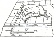 Рис. Определение расстояний по линейному масштабу с помощью циркуля