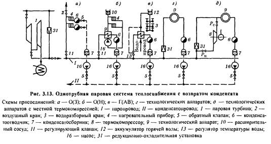 В практике промышленной теплофикации широко применяется однотрубная паровая система с возвратом конденсата (рис. 3.13).