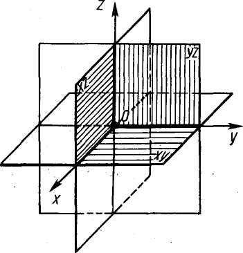 Возьмем три взаимно перпендикулярные прямые x, y, z, пересекающиеся в точке O. Через каждую пару прямых проведем плоскости. Получим три плоскости xy, xz и yz.
