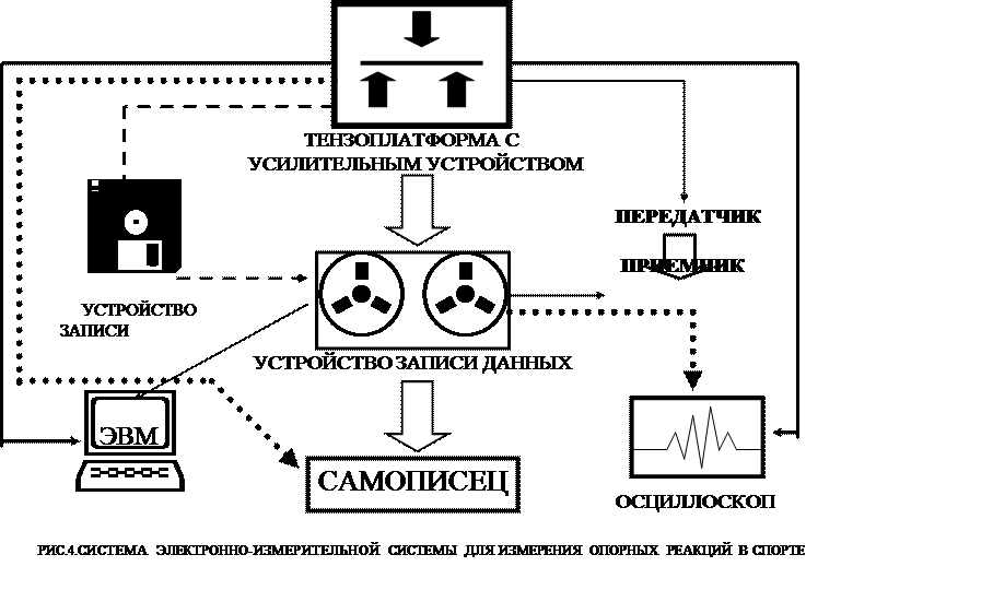 Измерительные установки состоят из функционально объединенных средств измерений и вспомогательных устройств, собранных в одном месте. В измерительных системах эти средства и устройства территориально разобщены и соединены каналами связи. Обычно такие системы автоматизированы и обеспечивают ввод информации в систему, автоматизацию самого процесса измерения, обработку и отображение результатов измерений для восприятия их пользователем. В качестве примера приводим систему тензодинамографических измерений в спорте (Рис.4).