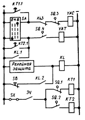 Рассмотрим схему управления батареями конденсаторов по заранее заданной программе с помощью электрических часов ЭЧ (рис. 3.5). При замыкании контакта электрических часов ЭЧ, что происходит в установленное время, срабатывает реле времени КТ1, контакты которого замыкают цепь на включение выключателя конденсаторной батареи. При включении выключателя переключаются его вспомогательные контакты SQ.1 и SQ.2, размыкая цепь обмотки реле КТ1 и замыкая цепь обмотки реле времени КТ2. Теперь уже при новом замыкании контакта ЭЧ, что должно произойти к тому времени суток, когда уменьшится потребление реактивной мощности с шин подстанции, сработает реле времени КТ2 и подаст импульс на отключение конденсаторной батареи. Поскольку контакт ЭЧ держится в замкнутом состоянии около 15 с, в схеме рассматриваемой автоматики использовано два реле времени – КТ1 и КТ2 с уставками 9-10 с. Очевидно, что при таких выдержках времени каждое замыкание контакта ЭЧ будет сопровождаться только одной операцией включения или отключения конденсаторной батареи. Второе же реле времени, которое начнет работать после переключения вспомогательных контактов выключателя, не успеет доработать за время, оставшееся до размыкания контакта ЭЧ.