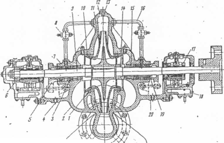 Відцентровий насос з двостороннім підведенням рідини (рис. 34) має горизонтальний вал. Корпус насоса складається з двох частин: нижньої 2 і верхньої 12. Осі приймального і нагнітального патрубків розташовані в горизонтальній площині і спрямовані протилежно Один одному, що спрощує монтажні та ремонтні роботи. На валу 9 на шпонці кріпиться робоче колесо 11 і утримується від осьового зсуву втулками 14 і * гайками 19. Для захисту деталей насоса від зношування ставляться захисні ущільнюючі кільця 10 і 1 Грунд-букса 15. Кільця сальникової набивки і гідравлічного ущільнення знаходяться в корпусах 7, вони закриті кришками 5 (з кожного боку). «Гідравлічний затвор» створюється підведенням перекачується рідини з нагнітальної порожнини до сальникам по трубах 8 я 16. Просочується з затвора рідина відводиться через нарізні отвори 4 і 20, що закриваються пробками. Вал обертається в підшипниках ковзання 7 і кульковому 6.