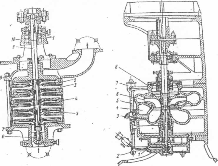 Секційний багатоступінчастий насос (рис. 35) складається з окремих секцій корпусу 2, секції поділяються діафрагмами 3. На вертикальний вал 9 жорстко на шпонках насаджені робочі колеса 4 з одностороннім входом рідини. Секції розташовані між верхньою кришкою 8 і нижньою 7, стягнутих анкерними болтами. У нижній кришці влаштований приймальний патрубок з фланцем, у верхній – нагнітальний Вал має нижній упорний підшипник ковзання 6 і два радіальних шарикопідшипника 1, встановлених в кронштейні 10. Підшипники змащуються ковпачковими маслянками. Вихід вала ущільнюється сальником. Осьовий тиск, що виникає, розвантажується за допомогою отворів 5 в ступицях робочих коліс. Якщо насос працює в системі забортної води, деталі, стикаємі з нею, виготовляють з антикорозійних матеріалів. Число секцій в насосі можна збільшувати, цим досягають більш високий натиск. Самовсмоктуючий відцентровий насос (рис. 36) має одо кільцеву ступінь 1, яка відсмоктує повітря з камери 8 у всмоктувальній трубі 5. Труба має безповоротний клапан 7 і грязевідстійник 2. Через триходовий кран 3, повітря відводиться в атмосферу. При відсутності повітря триходовий кран, направляє воду безпосередньо на робоче колесо б відцентрової ступені. Якщо очікується велике надходження повітря з всмоктуючої порожнини, триходовий кран залишається відкритим в атмосферу.