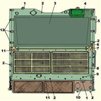 | 1.Открывание крыши над силовой передачей | -ключ изогнутый S=27 к пробкам баков, болтам крепления крыши над трансмиссией; -или ключ-рукоятка S=27 к пробкам баков, болтам крепления крыши над трансмиссией и для поддерживания стержня при выбивании пальцев гусеницы; -спецломик; | -вывернуть болты 2;