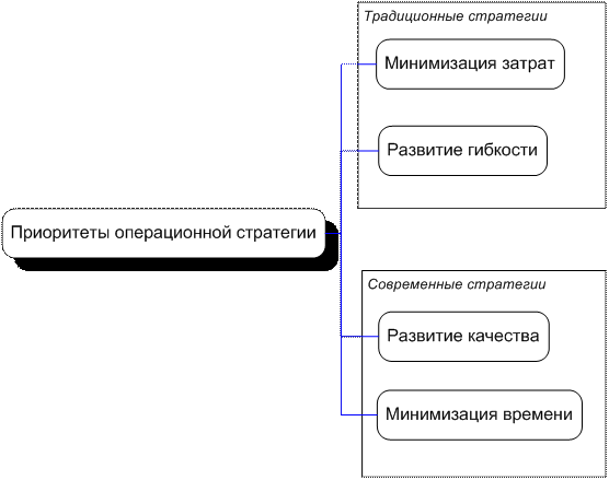 Операционные стратегии разделяются на виды по выделяемым в работе приоритетам функционирования операционной системы бизнеса. К таким приоритетам относятся: (см. Рисунок 1):