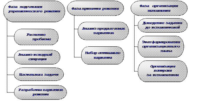 Процесс принятия управленческого решения состоит из трёх фаз: подготовки, принятия решения и фаза организации выполнения. Каждая фаза включает этапы принятия решения.