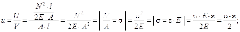 Для удобства расчетов полученную потенциальную энергию упругой деформации относят к объему стержня, то есть получают удельную потенциальную энергию упругой деформации, которая характеризует только свойства материала нагруженного стержня.