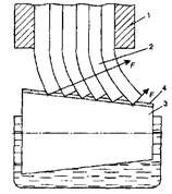 Схема заклейки блоков коническими роликами после фрезерования поверхности: 1 - зажим; 2 - тетради блока; 3 - конический ролик; 4 - клеевой слой;