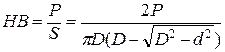 Испытание на твердость по Бринелю проводится путем вдавливания стального закаленного шарика диаметром 10 мм, 5 мм или 2,5 мм под действием нагрузки, величина которой определяется толщиной образца и уровнем измеряемой твердости (табл.4.1). После снятия нагрузки на поверхности остается отпечаток, который измеряют с использованием особой лупы с делениями. Твердость определяется по формуле: