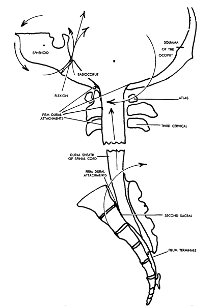 При собственном физиологическом движении крестца между двумя подвздошными костями натяжение твердой мозговой оболочки спинного мозга вынужденное, так как мембрана, прикрепляющаяся вокруг большого затылочного отверстия приподнимается. Это побуждает крестец к движению, при котором его основание смещается в дорзокраниальном направлении, а верхушка в вентральном направлении. Это респираторная флексия крестца.