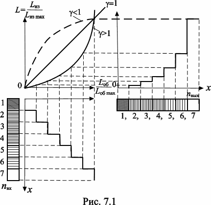 На рис. 7.1 показано графически возникновение нелинейных искажений при коэффициенте g >1. Нетрудно видеть, что нелинейные искажения будут присутствовать при любых значениях g ¹ 1 . В частном случае при g = 2, как видно из рис. 7.1, перепады яркостей первых нескольких ступенек будут практически неразличимы, и они сольются. Следовательно, количество видимых градаций уменьшается.