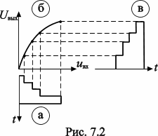 Рассмотрим графически искажения градаций яркости изображения при коэффициенте g >1. Для удобства количественной оценки нелинейных искажений на вход исследуемого устройства подают напряжение равноступенчатого сигнала.