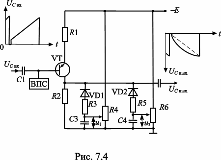 В схеме корректора с нелинейной нагрузкой в коллекторной цепи (рис. 7.4) величина коэффициента передачи меняется в результате изменения сопротивления нагрузки каскада. Аналогично предыдущей схеме (рис. 7.3) эквивалентное сопротивление нагрузки данного каскада будет уменьшаться по мере открывания диодов VD1 и VD2 , т. е. поочередно по мере увеличения входного сигнала, в зависимости от напряжения задержки U1 и U2 , задаваемого резисторами R4 и R6 . В отличие от предыдущей схемы коэффициент усиления этого корректора будет уменьшаться по мере увеличения амплитуды сигнала на входе ( gк < 1).