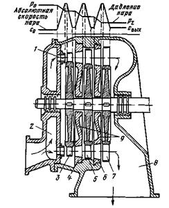 Пар поступает в одно или несколько сопл 4, приобретает в них значительную скорость и направляется на рабочие лопатки 5. Отработанный пар удаляется через выхлопной патрубок 8. Ротор турбины, состоящий из диска 3, закрепленных на нем лопаток и вала 1, заключен в корпус 6. В месте прохода вала через корпус установлены переднее 2 и заднее 7 лабиринтовые уплотнения, предотвращающие утечки пара. Так как весь располагаемый теплоперепад срабатывается в одной ступени, то скорости потока в соплах оказываются большими. При расширении, например, перегретого пара, имеющего параметры 1 МПа и 500 °С, до давления 10 кПа теплоперепад округленно равен 980 кДж/кг, что соответствует скорости потока 1400 м/с. При таких скоростях потока неизбежны большие потери и, самое главное, недопустимые по условиям прочности лопаток окружные скорости в них. Поэтому одноступенчатые турбины Лаваля имеют ограниченную мощность (до 1 МВт) и низкий КПД. Все крупные турбины делают многоступенчатыми. На рис. 20.4 показана схема активной многоступенчатой турбины, которая включает несколько последовательно расположенных по ходу пара ступеней, сидящих на одном валу. Ступени отделены друг от друга диафрагмами, в которые встроены сопла.
