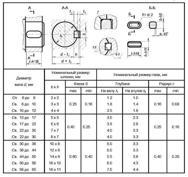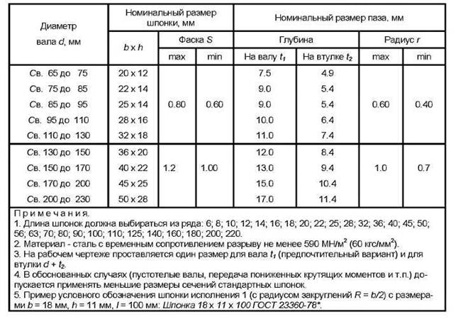 Основные размеры соединений с призматическими шпонками Основные размеры шпонок и шпоночных пазов в соединениях с призматическими шпонками даны в таблице 1 Таблица 1 Основные размеры шпонок и шпоночных пазов Продолжение таблицы 1