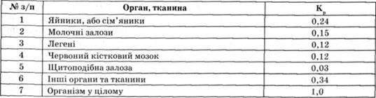 Таблица Коэффициенты радиационного риска Кр различных органов (тканей) при равномерном облучении всего организма человека