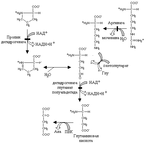 Дегидрогеназа пролина окисляет молекулу пролина с образованием продукта (дегидропролин), который спонтанно неферментативным путем гидролизуется с образованием глутаминового полуальдегида. Путь к этому соединению у аргинина начинается с реакции, катализируемой аргиназой и орнитин –продукт этой реакции после переаминирования с a –кетоглутаратом также превращается в глутаминовый полуальдегид. Специфическая дегидрогеназа глутаминового полуальдегида окисляет его с образованием глутаминовой кислоты.