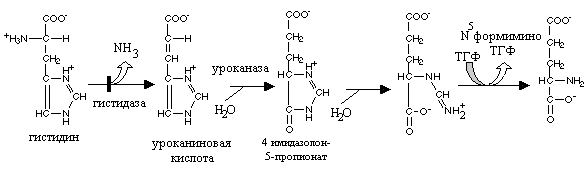 Путь к глутаминовой кислоте у гистидина более долгий. Гистидин дезаминируется специфической дезаминазой – гистидазой с образованием уроканиновой кислоты. Уроканаза превращает уроканиновую кислоту в 4-имидазолон-5-пропионат, который гидролизуется с образованием N-формиминоглутамата и после переноса формиминогруппы на тетрагидрофолат образуется глутаминовая кислота. При недостатке фолиевой кислоты в организме, последняя реакция частично или полностью блокируется и второй продукт реакции N-формиминоглутамат выделяется почками. Это используется для исследования недостаточности фолиевой кислоты: после нагрузки гистидином в моче появляется N-формиминоглутаминовая кислота.