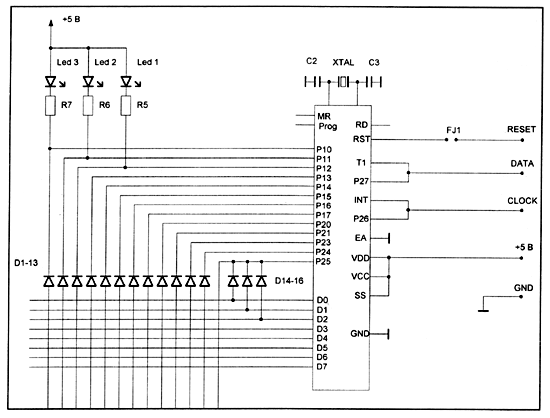На рис.7 видно, что информационные линии Р10—Р25 и D0—D7 образуют клавиатурную матрицу, в узлах которой находятся контакты клавиш. Контроллер клавиатуры постоянно опрашивает состояние информационных линий. При замыкании любого контакта вырабатывается код клавиши, который передается в компьютер. Для синхронизации всех событий используется кварцевый резонатор XTAL.