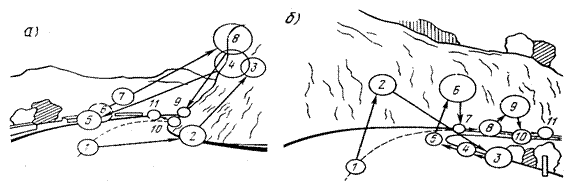 Рис. 13.3. Перемещение взгляда водителя при проезде кривых в плане на горных дорогах (по опытам В.П. Варлашкина): а - выпуклая кривая; б - вогнутая кривая; номера точек соответствуют последовательности сосредоточения взгляда водителя; диаметры кружков - относительной его продолжительности