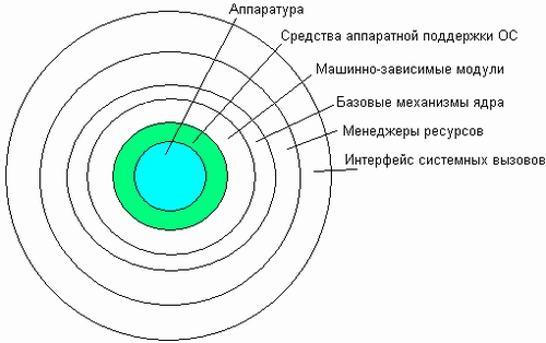 Поскольку ядро представляет собой сложный многофункциональный комплекс, то многослойный подход обычно распространяется и на структуру ядра.