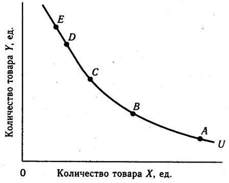 Кривая безразличия (U) представляет собой совокупность потребительских наборов, каждый из которых имеет одинаковую полезность для потребителя (рис. 1).