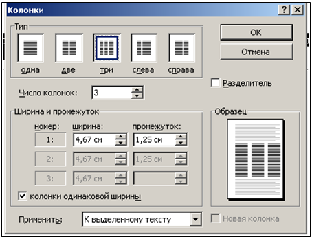 Если перед выполнением команды Формат – Колонки текст не выделяется, то колонки будут применены к текущему разделу, а если разделов нет, то ко всему документу.