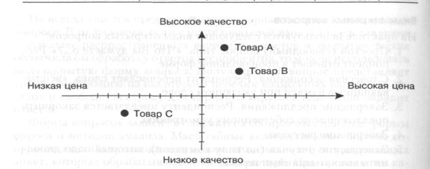 2 Графические шкалы выглядят как луч с нанесенными вариантами ответов. Графическое изображение может быть одномерным, рисунок 1, когда для представления вариантов ответов используется одна ось, или многомерным.Наиболее известным примером многомерной графической шкалы является карта-схема восприятия марок респондентами, которую называют шкалой восприятия; представлена на рисунке 2. При построении многомерной шкалы первоначально выделяются характеристики, по которым респонденты оценивают объекты (марки), затем разрабатываются шкалы для получения непосредственной оценки объектов по выделенным характеристикам.