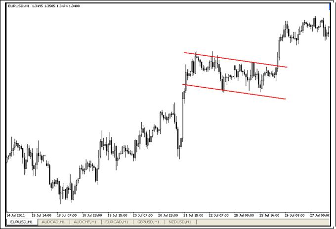 Флаг обычно образуется в паузе между периодами сильного направленного движения на рынке. Формированию флага предшествует очень быстрое направленного движение, после которого цены входят в боковой коридор обычно с параллельными линиями уровнями поддержки и сопротивления, либо с легким налоном в сторону обратную предыдущему движению.