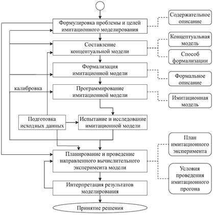 Вне зависимости от типа моделей (непрерывные и дискретные, детерминированные и стохастические и т.д.) имитационное моделирование включает в себя ряд основных этапов, представленных на рис. 7.3 и является сложным итеративным процессом: